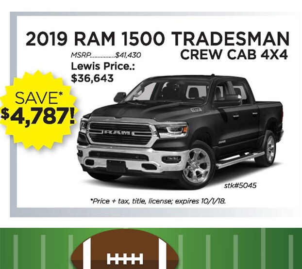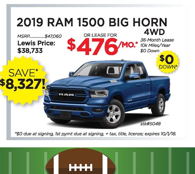 *Manufacturer incentives subject to change without notice. All offers to finance on approved credit, subject to final lender approval. Payments plus tax, title, and license. Payments includes all acquisition and disposal fees, and $249.95 doc fee. ^Total savings based on 2019 RAM 1500 Big Horn - stock #5048. Offers expire 10/1/2018. See dealer for complete details.