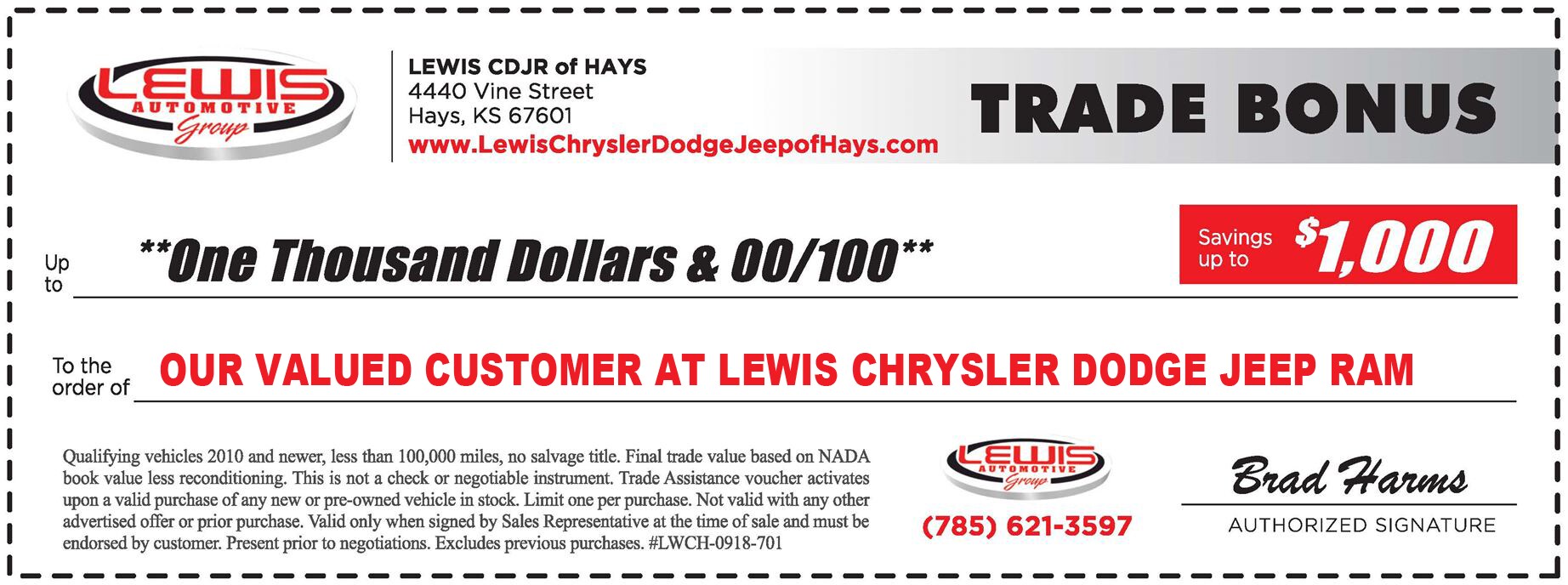 Please bring in this letter or call Brad Harms at: 785-621-3597 to schedule a convenient appointment and allow us the opportunity to make you an offer. A simple visit and quick vehicle appraisal is all it takes!