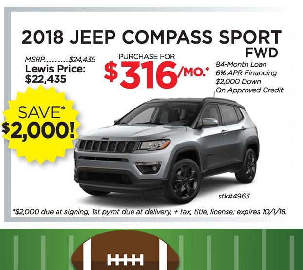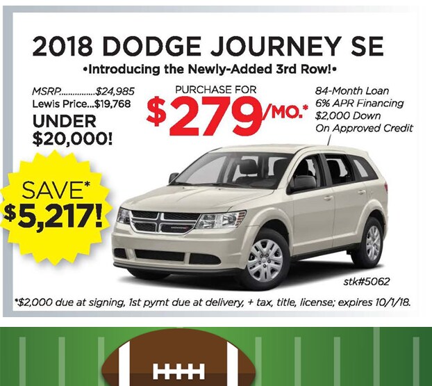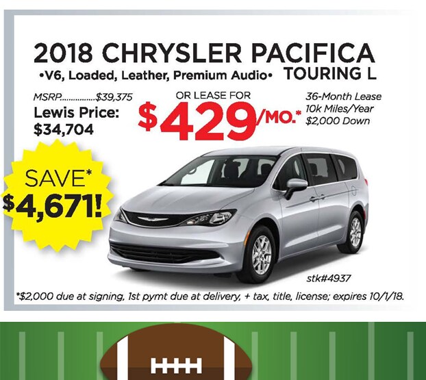 We would like to invite you to the KICK-OFF TO SAVINGS EVENT at Lewis Chrysler-Dodge-Jeep-RAM where you can enjoy LOW LEASE PAYMENTS! Or, get low-rate financing on every new vehicle in stock and savings up to $8,327 on select models.^ Plus, during this event we have authorized our managers to allow MORE for your trade-in!